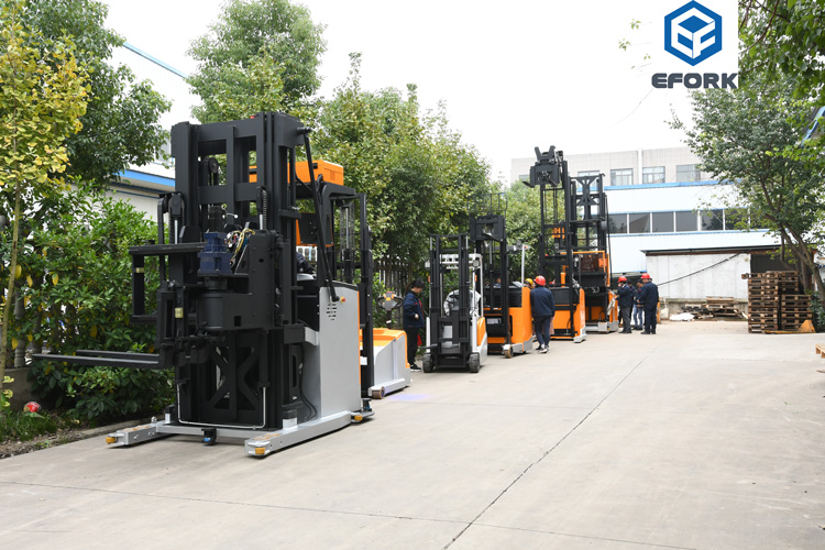 The three-way stacker forklift is equipped with mechanical guide rail lane mode, large diameter load-bearing wheels, and full-wheel electromagnetic brakes. The braking distance is short, the response is timely, and the braking effect is excellent. Combined with the end-of-lane deceleration function, it ensures safe driving and operation. The forklift can also be equipped with dual deep-position telescopic forks and electric adjustable forks to further improve warehouse storage capacity and forklift safety.